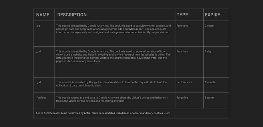 Your personal data will be collected via cookies and other similar tracking technologies with prior consent from you. We will maintain a record of the types of cookies that you have authorized us to use and ensure adherence to your preferences. If you do not wish to accept cookies from the MAS website you can - leave this web site, or configure your browser to either notify you when you receive a cookie (giving you the chance to decide whether to accept it) or to block all or certain categories of cookies. The browser can also delete previously stored cookies. Please see your browser's help facility for information on setting how cookies are handled and managing cookie preferences.